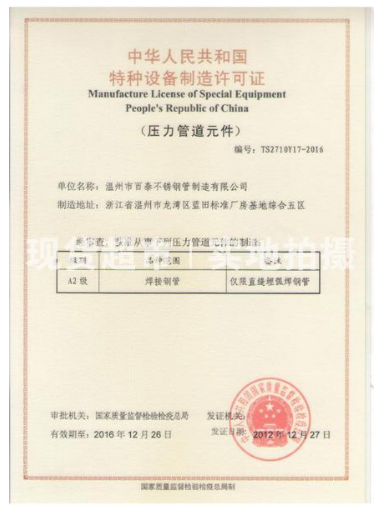 溫州市百泰不銹鋼管制造有限公司已取得國家特種設備制造許可證及ISO9001:2008質量體系,整套生產及檢測設備先進齊全,擁有800噸7米長液壓成型卷管機、1000噸10米長液壓成型卷管機、300噸液壓成型機、進口自動焊機、自動等離子機、液壓剪板機、X射線探傷機、水壓試驗機、冷拔機等。